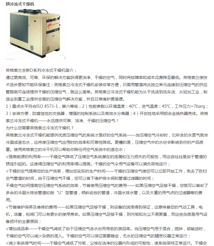 •        濟南銳博特機械設備有限公司是英格索蘭空氣壓縮機的授權(quán)代理商,代理銷售美國英格索蘭全系列的空壓機及后續(xù)處理設備。公司自成立以來,經(jīng)過公司全體同仁不斷努力,開拓創(chuàng)新,以優(yōu)良的技術(shù)、完善的售后服務,使得公司贏得了一個又一個的誠心客戶。我公司擁有多名專業(yè)的銷售及售后服務人員,為客戶提供空壓系統(tǒng)的售前、售中及售后的全方位優(yōu)質(zhì)服務。另公司有多名具有英格索蘭壓縮機授權(quán)服務證書的服務工程師,能維修和保養(yǎng)國內(nèi)外各種品牌空壓機,公司各種國內(nèi)外品牌空壓機配件庫存齊全。